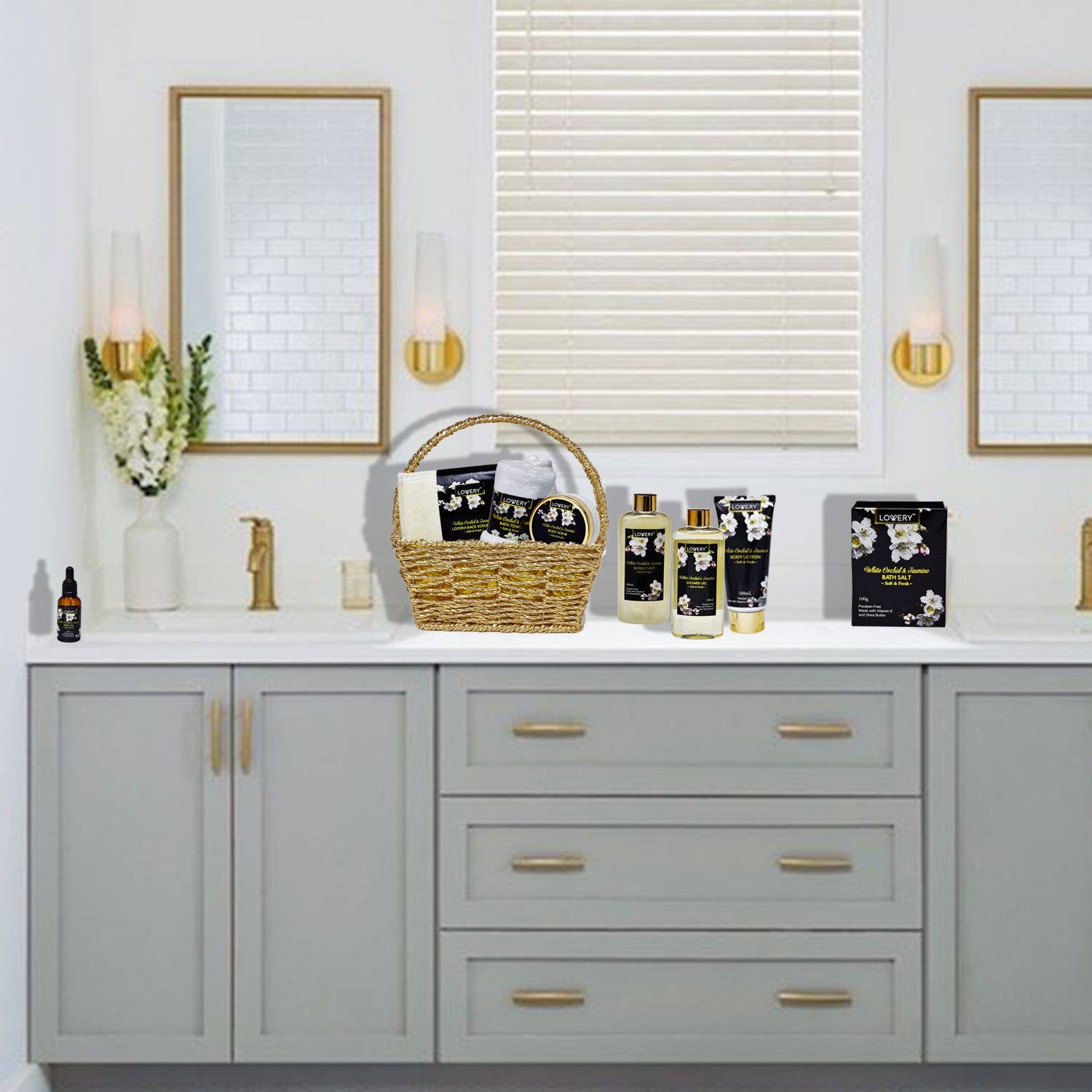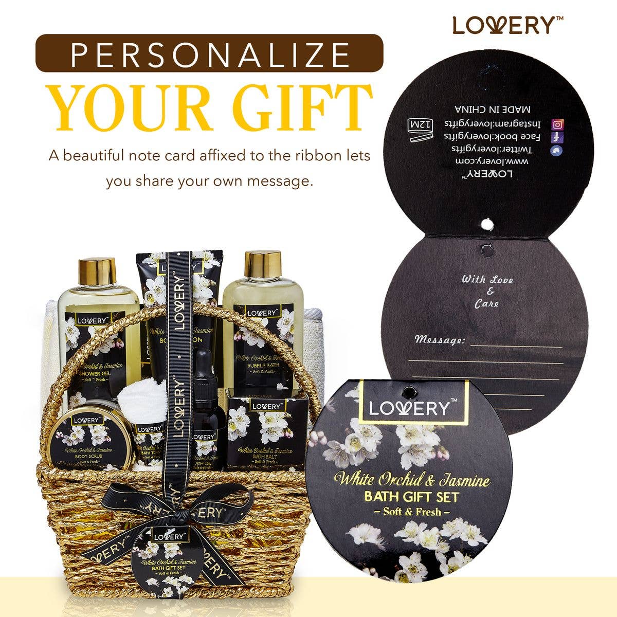 This spa gift basket has everything a woman needs! It includes Shower Gel, Bubble Bath, Body Lotion, Bath Salt, Body Scrub, Bath Oil, a Bath Towel and a Loofah Back Scrubber. Packed in a stunningly wrapped gold wire basket, it also has a gift note card for you to personalize it.