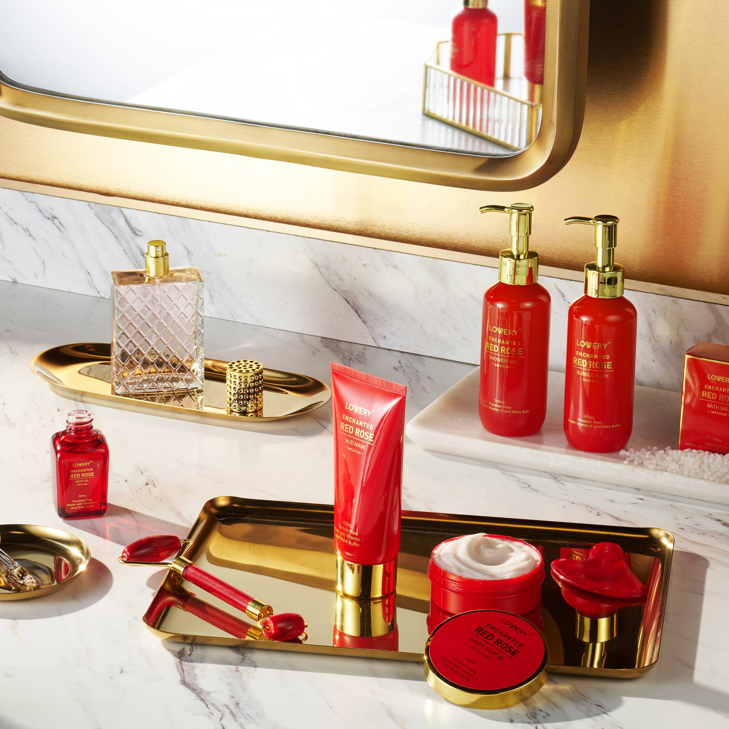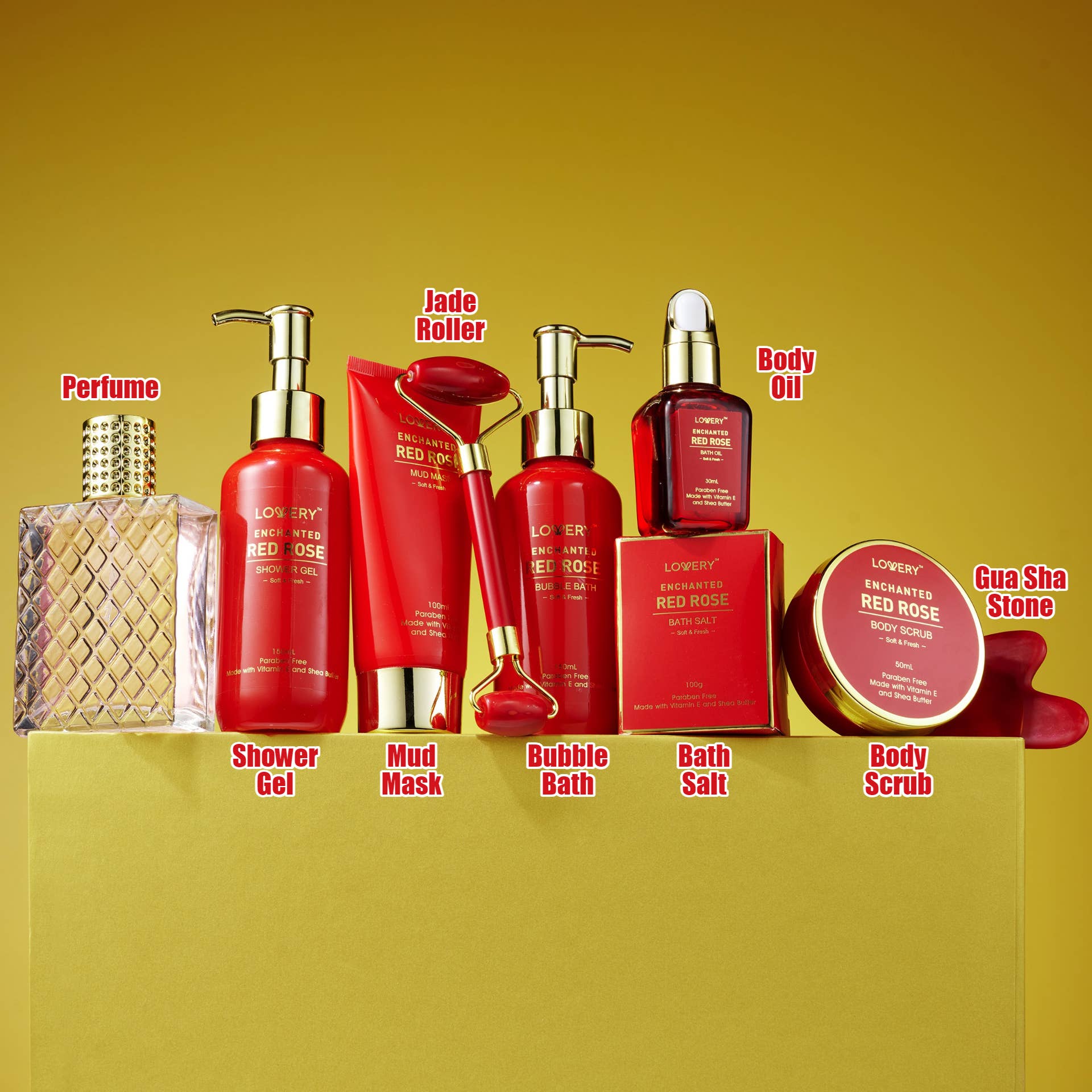 AROMATHERAPY GIFT SET - Crafted with moisturizing Shea Butter and nourishing Vitamin E, the Red Rose Spa Kit helps you unwind and relax amid a calming aroma as your hair, skin, and body rejoice in the anti-aging effects. This beautiful fragrant flower is the universal symbol of love and exerts a positive soothing effect on mind, body and skin. The delicate wafting aroma of rose petals helps to calm restlessness and irritability and relieve stress.
